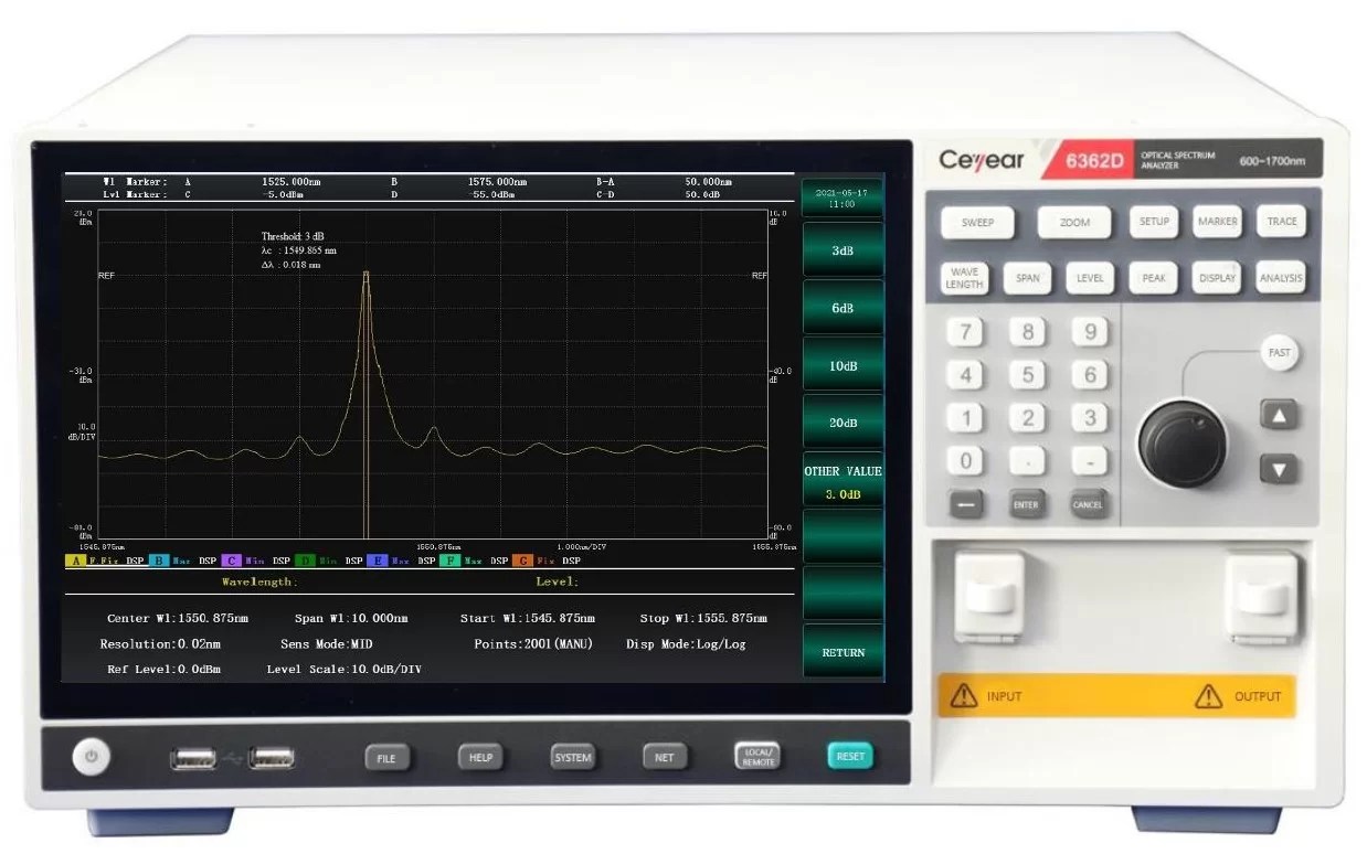 6362D is a high-resolution, large-dynamic, high-speed, high-performance optical spectrum analyzer. It is perfect for testing 600 nm to 1700 nm optical systems, such as DWDM and optical amplifiers; It can also be used for optical active and passive device testing, such as LED, FP-LD, DFB-LD, optical transceivers and optical fibers and fiber gratings and other optical devices.